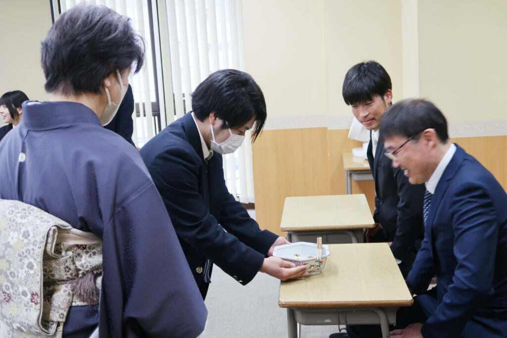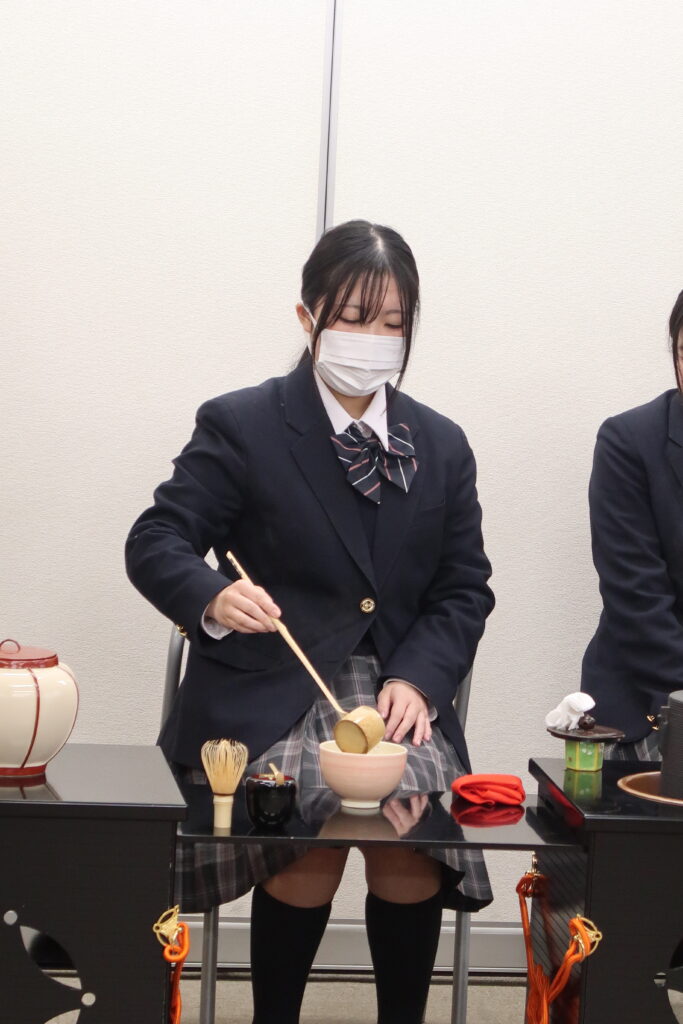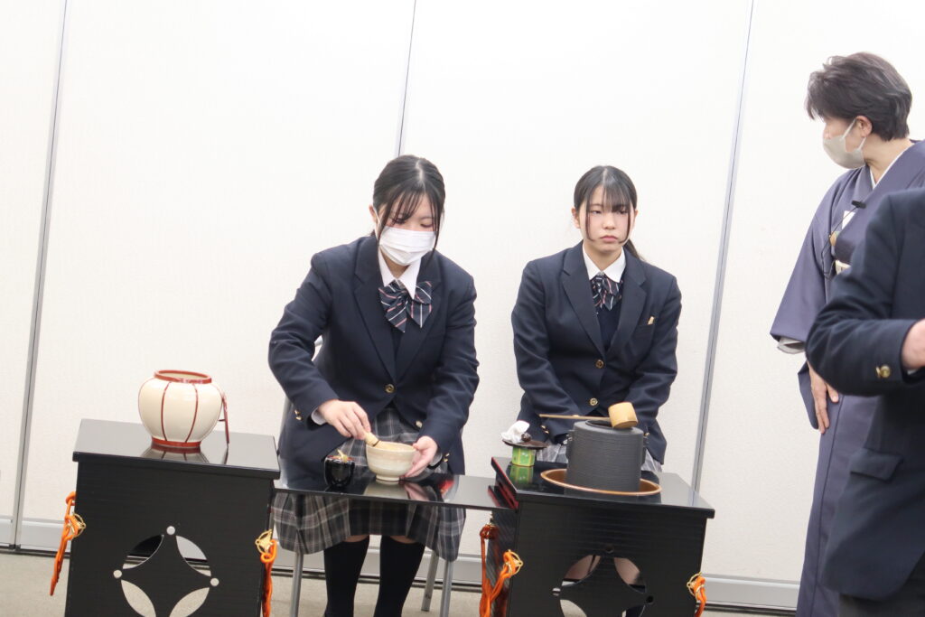 また、学生によるお点前披露しました。 緊張した面もちですが先生からご指導いただきながら、