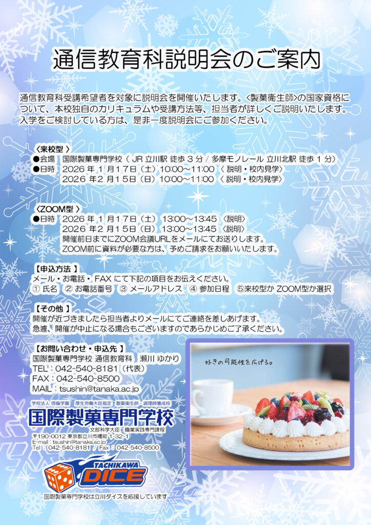 1年間で「国家資格 製菓衛生師」の受験資格取得ができる、