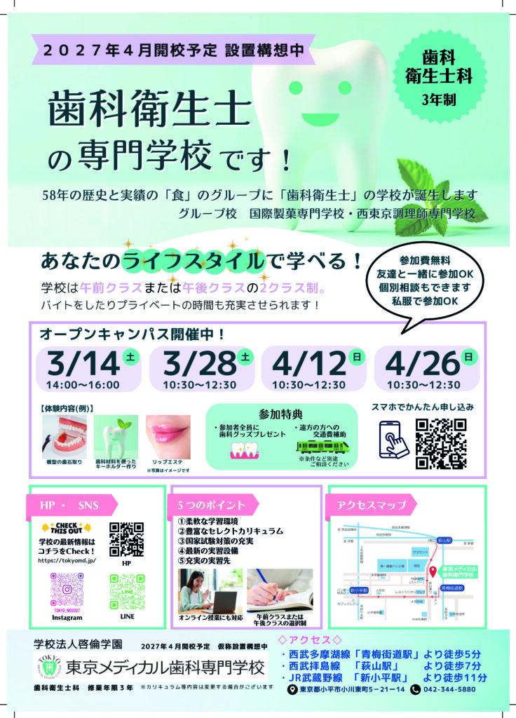 このたび、田中教育グループとして初となる医療系の学校 「東京メディカル歯科専門学校」(仮称・設置構想中) が、令和9年(2027年)4月に開校予定です。